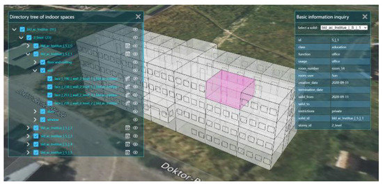 The directory tree of indoor spaces shows the indoor spaces contained in each floor (2 level, 1 level, ground level, and basement), and by selecting any of these spaces, the basic information of the indoor space and its building component information can be queried. As shown in Figure 18, the basic information of room_14 on the floor of 2 level, such as function, class, user, and the building component information of the room, can be queried through the directory tree.