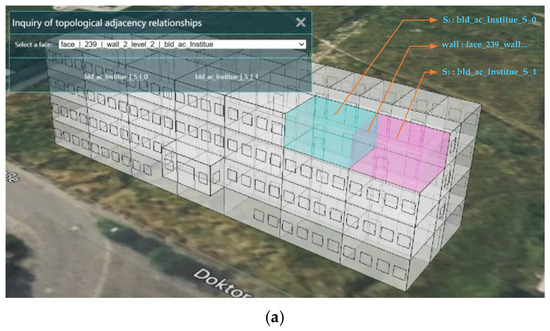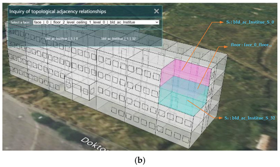 The topological adjacency relationships of indoor spaces are important for indoor navigation and emergency rescue. Through the topological adjacency query, the topological adjacency relationship between two adjacent indoor spaces can be queried, as shown in Figure 19. Through a wall surface of a room, two adjacent rooms associated with the wall surface on the same floor can be queried, and through a ceiling or floor surface of a room, two adjacent rooms associated with the ceiling or floor surface on two adjacent floors can be queried. For example, through wall surface “face_239……”, two adjacent rooms, “bld_ac_Institute_S_0” and “bld_ac_Institute_S_1”, associated with the wall surface on the floor of 2 level can be queried (Figure 19a). Two adjacent rooms, “bld_ac_Institute_S_0” and “bld_ac_Institute_S_32”, associated with the floor surface on adjacent floors 2 level and 1 level can be queried through the floor surface “face_0……” (Figure 19b).
