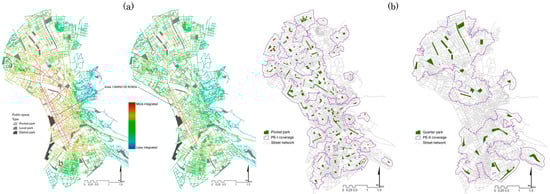 (a) Global integration (HHRn) and local integration (HHR3). (b) Accessibility coverage based on public space (Talavera-Garcia, 2012) [1].