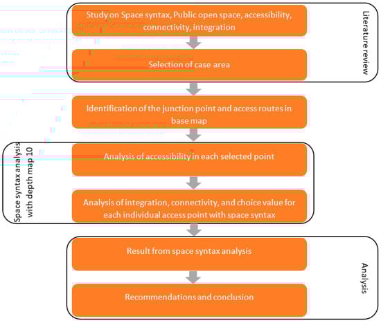 Extensive research has been conducted from an urban design perspective to explore the interplay between accessibility, configurational centrality, and the core value of integration in open spaces. This has involved referencing the relevant literature and utilizing the space syntax technique as the primary tool. Through this approach, we identified the most integrated roadways and evaluated the connection values of the entire city network of Dhaka to define the spatial configuration of the Hatirjheel Link Road. Figure 3 depicts the research process followed in the study. Space syntax is one of the most extensively used techniques for explaining how a location’s spatial organization affects street connection and pedestrian mobility. This method identifies the best route or street to reach in a public space to achieve quality accessibility.