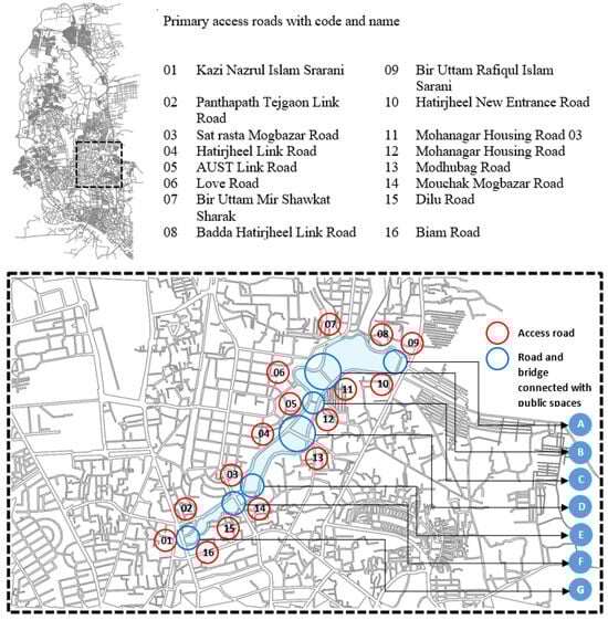 Location of study area with 16 access roads. Selected analyzing points of connected roads and bridges with Hatirjheel Lakefront’s public spaces. The roads and bridges that connect the two sides of Hatirjheel’s lakefront are A–G.