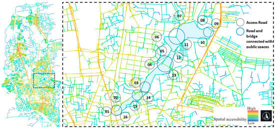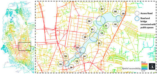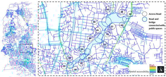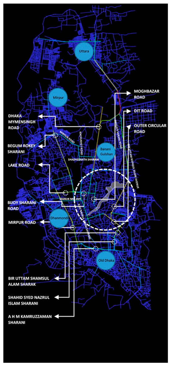 A new 60-foot-wide ring road is being built around the water body to preserve the water from further encroachment. Hatirjheel is considered an urban landscape project because of its mostly mid-income and mid-density setting. Water could reshape the current urban fabric by fostering “interplays between infrastructure, urbanism, and landscape” and acting as a space organizer [58]. The 320-acre Hatirjheel Begunbari development project is a remarkable urban open space in the capital city that connects Banasree and Gulshan in north Dhaka, to the Sonargaon Hotel in Moghbazar in the south. Hatirjheel’s research area includes 16 access roads and 6 bridges connected with public space, as depicted in Figure 4. The area will be assessed through space syntax analysis.