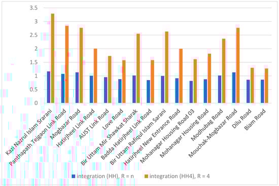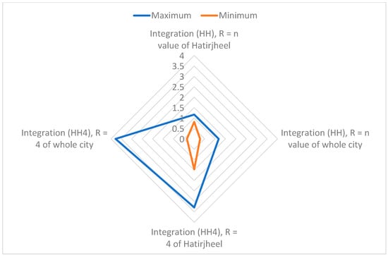 From the above graphics, it can be seen that the ranges of the global integration values of the access roads are almost similar, which means that the study area is connected correctly with the overall city. Still, the range of local integration values varies greatly (Figure 16). From Figure 9, Figure 10, Figure 11, Figure 12, Figure 13, Figure 14 and Figure 15, many access routes are not well connected to the open areas used by the public of Hatirjheel. Still, the local integration values are in good condition, which indicates that the study area is locally connected.