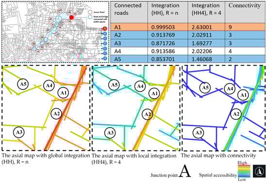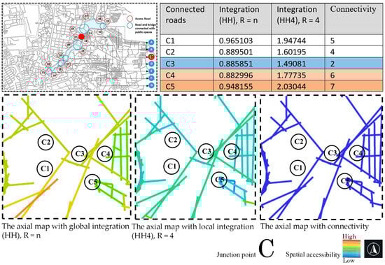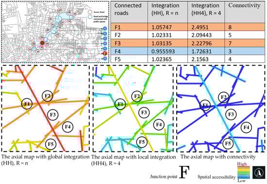 Global integration gives an international measure of one line’s relative segregation and integration relative to all others. Axial lines with warmer colors indicate higher global or local integration values (Figure 1).