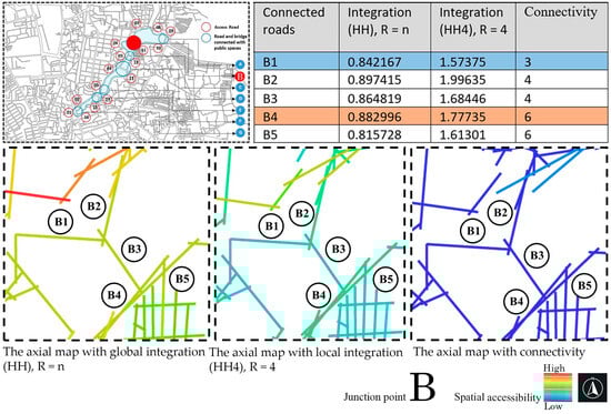 Figure 10 presents the spatial analysis of the access roads at Junction Point B (B1 to B5), highlighting their roles in connectivity and integration within the network. B2 was identified as the most integrated road, with the highest global integration value (0.897415) and local integration value (1.99635), indicating its strong connectivity to the overall urban network and its ability to facilitate movement on city-wide and neighborhood scales. B4 also plays a critical role, with the highest connectivity score (6) and moderately high integration values (0.882996 for global and 1.77735 for local integration), making it a vital access road for localized interactions and connections. B3 shows balanced performance, with global integration (0.864819), local integration (1.68446), and a connectivity score of 4, suggesting its moderate contribution to local and broader accessibility. In contrast, B1 exhibits lower global integration (0.842167) and local integration (1.57375) values and a connectivity score of 3, reflecting its relatively limited accessibility and importance. B5, with the lowest global (0.815728) and local integration (1.61301) values and a connectivity score of 3, is the least significant road at this junction, playing a minimal role in enhancing connectivity. This analysis emphasizes B2 and B4 as key access roads for improving spatial accessibility and connectivity at Junction Point B, while B1 and B5 have limited influence on the overall network. The axial maps visually support these findings, with warm colors highlighting higher integration and connectivity values for B2 and B4 compared to the cooler tones for B1 and B5.
