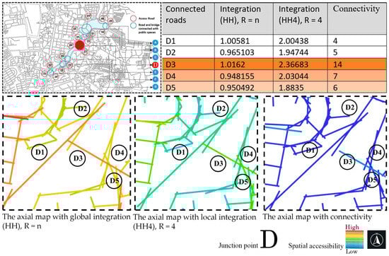 Figure 12 analyzes the access roads connected to Junction Point D (D1 to D5) using global integration, local integration, and connectivity metrics. D3 is the most significant road, with the highest global integration (1.0162), local integration (2.36683), and an outstanding connectivity score of 14, making it a critical contributor to city-wide and neighborhood-level accessibility. D1 also shows high importance, with the second-highest global integration (1.00581) and local integration (2.00438), and a connectivity score of 4, emphasizing its role in broader network integration. D4 is another prominent road, with a high connectivity score (7) and strong local integration (2.03044), supporting localized movement and connections. D5 demonstrates moderate accessibility, with global integration (0.950492), local integration (1.88355), and a connectivity score of 6. D2, while having high global integration (0.965103) and local integration (1.94744), has a lower connectivity score of 5, indicating more limited direct links, despite its broader integration. The axial maps visually highlight D3 as a highly integrated and well-connected road with warm colors, while D4 and D1 also appear as significant contributors, and the cooler tones around D2 and D5 reflect their slightly lesser roles. Overall, D3 emerges as the dominant access road at Junction Point D, with D1 and D4 also playing key roles in connectivity and accessibility.