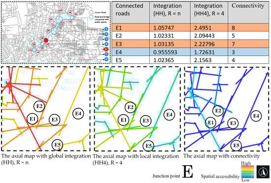 Figure 13 presents the spatial analysis of access roads connected to Junction Point E (E1 to E5) based on global integration, local integration, and connectivity metrics. E1 is the most significant access road, with the highest global integration value (1.05747) and local integration value (2.4951) and a connectivity score of 8, making it the central contributor to city-wide and neighborhood-level accessibility. E3 also plays a key role, with strong global integration (1.03135), high local integration (2.22796), and a connectivity score of 7, supporting its role in localized and broader connectivity. E2 shows moderate values for global integration (1.02331) and local integration (2.09443), but has a lower connectivity score of 5, indicating fewer direct links despite its spatial importance. E5 demonstrates balanced performance, with global integration (1.02365) and local integration (2.1563), but a limited connectivity score of 4. In contrast, E4 has the lowest global (0.955593) and local integration values (1.72631), and a connectivity score of 3, making it the least integrated access road in this junction. The axial maps visually emphasize E1 and E3 as critical roads, with warmer colors indicating high integration and connectivity, while the cooler tones highlight the relatively limited roles of E4 and E5. Overall, E1 and E3 are the most vital contributors to Junction Point E’s spatial accessibility, with E4 and E5 playing minimal roles.