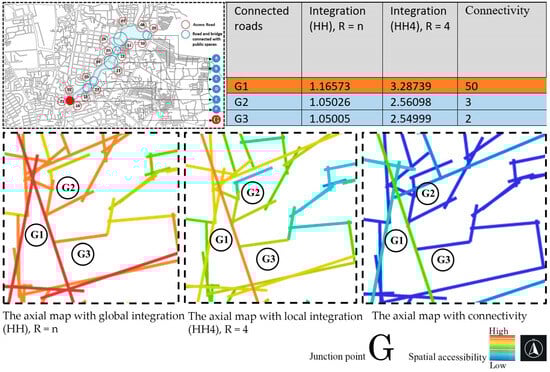 Figure 15 analyzes the access roads connected to Junction Point G (G1 to G3) using global integration, local integration, and connectivity metrics. G1 is the most significant road, with the highest global integration (1.16573), exceptionally high local integration (3.28739), and an outstanding connectivity score of 50, making it a dominant link for city-wide and localized accessibility. In comparison, G2 has moderate global integration (1.05026), local integration (2.56098), and a low connectivity score of 3, indicating its limited role in direct links, despite its reasonable integration levels. G3, while showing similar global integration (1.05005) and local integration (2.54999) to G2, has the lowest connectivity score (2), marking it as the least influential road at this junction. These conclusions are graphically supported by the axial maps, where G1’s dominant integration and connectedness are highlighted in the warmest hues, while G2 and G3’s more constrained roles are shown in cooler tones. In every parameter, G1 performs noticeably better than G2 and G3, making it the primary access route at Junction Point G.