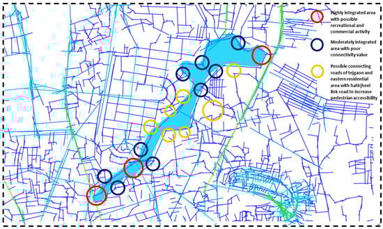 Based on the overall research, it is obvious that Hatirjheel is separated to some extent from the city’s principal roads. Some roads between Tejgaon and the east residential area are not connected with the Hatirjheel Link Road, resulting in poorer integration and connection values. Just one road passes through the area, and other access roads are next to axial lines that are highly integrated, underdeveloped, and distant from the global integration center. Though the connection is better for vehicular accessibility connecting the south and south-west areas (old Dhaka, Dhanmondi) with the north and north-west areas (Mirpur, banana, badda, Uttara), the emphasis should be on pedestrian connectedness. Local assessment should be established based on neighborhood (local) activity patterns. Tejgaon and the east residential areas should be invited to enjoy the open spaces, because there is a lot of potential for improving Hatirjheel’s waterfront activity. It is clear from this analysis that the Hatirjheel open spaces are moderately integrated with the rest of the city, and that there are opportunities to improve its integration value by connecting the east- and west-side roads with the Hatirjheel Link Road (Figure 19).