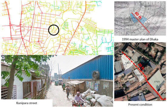 According to this report, several factors are encroaching on some street widths and interfering with these routes’ ability to connect with the Hatirjheel Link Road. As a result, those streets have a low integration and connectedness value. For example, some of the proposed 60-foot-wide roadways have been reduced to 20-foot-wide, due to nearby encroachment [48]. South Kunipara Street was designed to be 60 feet in Dacca’s master plan 1994. According to the layout, the roadway was intended to be 200 m long, but these new plots only occupy around 130 m of that length. Plots 136/1 and 133/1, which were recently built, fully occupy Kunipara Street, as seen in Figure 14. Because of this land use, there is no roadway, a failure that can be traced to RAJUK’s insensitivity. Plot 171/1 has the most street area. As a result, the Hatirjheel connecting road is not connected to the current Kunipara Street, which is now barely 20 feet long. Many streets, such as Kunipara Street, are not connected because freshly developed plots do not consider surrounding development or create scope for future expansion. Because of encroachment, all those roadways became dead ends [48] (Figure 20).