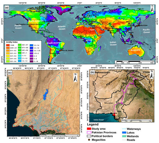 (a) The global aridity map categorizes Pakistan within the arid to semi-arid zone []. Panels (b,c) illustrate Karachi, the capital city of Sindh province, delineated by a red polygon in southern Pakistan using Landsat-8 imagery (RGB bands 7, 5, 2) highlighting the city’s primary water resources and infrastructure.