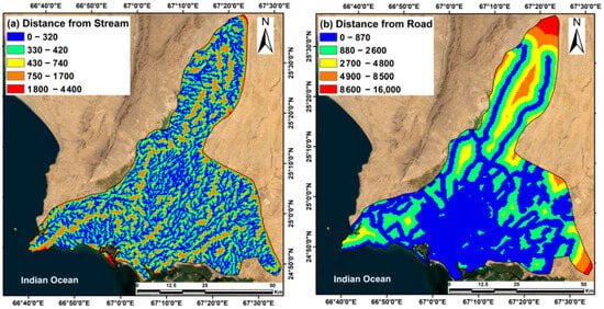 Spatial representation of accessibility data: (a) Distance from streams and (b) distance from roads.