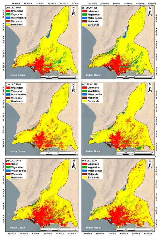 LULC map for Karachi city for the years (a) 1990, (b) 1995, (c) 2000, (d) 2010, (e) 2015, and (f) 2020.