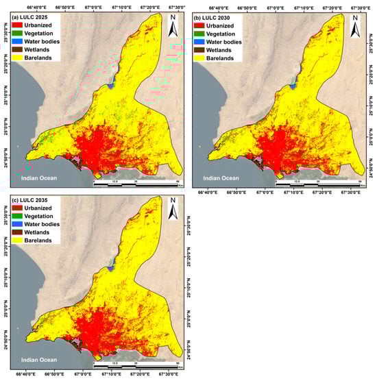 Predictive LULC maps for (a) 2025, (b) 2030, and (c) 2035 reveal a notable increase in urban class pixels, while those associated with water and vegetation classes show a decline, indicating conversion to urban land use.