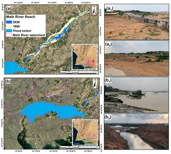 The dynamics of surface runoff in Karachi are influenced by soil permeability, changes in LULC, and local topography []. In this context, monitoring and predicting LULC changes, particularly in and around waterways, is crucial for mitigating and preventing flash floods. Drastic LULC alterations have destabilized stream ecosystems in Karachi, making them more prone to “flashy” behavior. This phenomenon is characterized by rapid rises in the upper limb of the hydrograph, leading to an increased incidence of flash floods and overall watershed degradation. The city’s uncontrolled and unplanned urban expansion has exacted a severe environmental toll, with natural resources being overexploited to meet the growing population’s needs. Consequently, Karachi faces declining freshwater resources and biodiversity loss—challenges that conventional urban management methods have proven ill-equipped to address effectively. This complex interplay of rapid urbanization, environmental degradation, and increased flood risk underscores the need for innovative urban planning and water resource management approaches in Karachi.