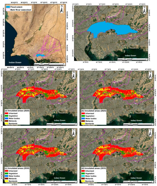 To assess the impact of land use dynamics on flood extent in Karachi, this study employed the HEC-RAS, a widely recognized open-source hydraulic model. The 2020 land use map, derived from the LULC classification process, served as the baseline for flood inundation analysis. A uniform Manning’s roughness coefficient of 0.04 was applied to the riverbanks for model simplification while maintaining urban terrain characteristics. The model was calibrated using the 2020 monsoon rain event and corresponding flood extent, accurately representing the study area’s hydraulic behavior under known conditions. Meteorological data, crucial for precise flood modelling, were obtained from the PMD Karachi, specifically utilizing a 3-hourly dataset from the Karachi Airport station. These data were then modified to reflect the extreme precipitation event of 27 August 2020, which saw an unprecedented 270 mm of rainfall within a 3 h period, resulting in an exceptionally high average rainfall intensity of approximately 90 mm/hr. An alternative scenario was also simulated to account for the uncertainty in the recurrence of such high-intensity rainfall events, distributing the same 270 mm of precipitation over a 12 h period, yielding a more moderate intensity of 22.50 mm/hr. This dual-scenario approach allows for a comprehensive flood risk assessment under extreme and more frequent rainfall patterns. Utilizing the calibrated HEC-RAS model in conjunction with the LULC predictions for 2025 and 2035, flood extent simulations were conducted for these future years under both rainfall scenarios. This methodology accounts for current conditions and anticipates future changes, providing valuable insights for long-term urban planning and flood mitigation strategies in Karachi’s rapidly evolving urban environment.