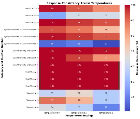 Heatmap illustrating the response consistency of GPT-4o across 15 cartographic design questions under three temperature settings.