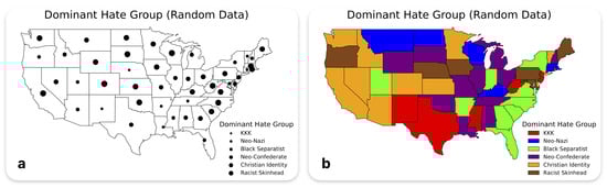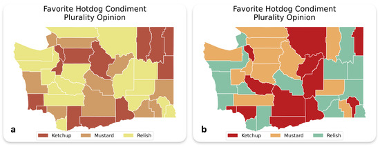 The model’s ability to interpret and critique visual cartographic elements was evaluated using an illustrative map that visualized regional preferences for hotdog condiments (ketchup, mustard, relish) based on plurality opinion (Figure 2a). This map, adapted from Krygier and Wood [], was intentionally designed with a misleading and problematic color scheme—hues of red, orange, and yellow—that violated best practices in cartographic design. These colors, being sequential and tonally similar, are neither colorblind-friendly nor sufficiently distinct, creating confusion for viewers. When prompted, the model successfully identified the issue, noting the inappropriate use of sequential colors for categorical data. It suggested a revised color scheme with more distinct and intuitive choices: red for ketchup, yellow for mustard, and green for relish, aligning with commonly associated color conventions. An example map created based on the suggestions is shown in Figure 2b. Additionally, the model demonstrated the ability to assess the appropriateness of color schemes for individuals with visual impairments, offering alternative recommendations to enhance accessibility.