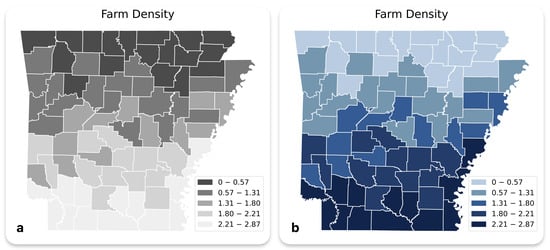 In Figure 3a, the map, reproduced from Krygier and Wood [], depicts farm density across a region using a monochromatic grayscale gradient, categorized into five ranges. This design, intentionally flawed, was employed to evaluate the model’s ability to critique and improve cartographic visuals. Grayscale palettes, while occasionally used in cartography, present significant challenges for interpretability, particularly for individuals with visual impairments or in low-light conditions. The minimal contrast between adjacent categories (e.g., “1.31–1.80” and “1.80–2.21”) diminishes clarity, making it difficult to discern spatial differences. Additionally, the color ramp in this map violates intuitive design principles, where darker shades typically represent higher values and lighter shades lower values. When prompted, the model successfully identified these issues, highlighting the perceptual hierarchy problem and suggesting a more effective approach (Figure 3b). It recommended replacing the grayscale scheme with a sequential multi-hue palette, such as transitioning from light blue for the lowest density to darker shades for higher ranges. Furthermore, the model demonstrated versatility by proposing texture patterns as an alternative solution for scenarios requiring grayscale, showcasing its ability to adapt visual variables for different contexts.