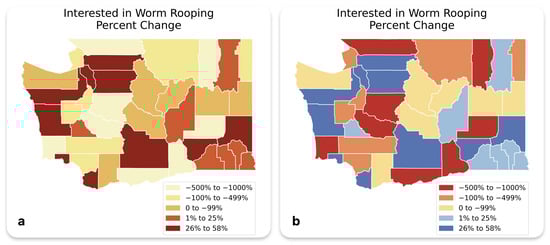 In Figure 4a, the map, reproduced from Krygier and Wood [], illustrates the percent change in interest in “Worm Rooping” across a region, segmented into six data ranges. The map uses a sequential red-to-yellow color palette, intentionally flawed to assess the model’s ability to critique and propose improvements for misleading visual designs. The current color scheme assigns highly saturated red hues to minimal positive percent changes (e.g., “1% to 25%”) while using lighter yellows for significant negative changes (e.g., “−500% to −1000%”), creating a misleading visual emphasis. This design misrepresentation can bias viewers into perceiving small increases as more impactful than large decreases. Additionally, the wide data bins for negative changes (e.g., “−500% to −1000%” and “−100% to −499%”) and the use of overly similar hues for distinct categories (e.g., “0 to −99%” and “1% to 25%”) obscure the granularity and accuracy of the information, reducing interpretability. The model effectively identified these issues, categorizing them as a lack of intuitive gradient and clarity in distinguishing positive from negative changes (Figure 4b). It proposed a more suitable color scheme that introduces a clear contrast between cool tones (light blue to dark blue for positive changes) and warm tones (light orange to dark red for negative changes), improving the visualization’s ability to convey the increasing or decreasing trends across regions. However, it is important to note that the use of cool tones for positive changes and warm tones for negative changes may vary depending on the data, as well as regional and cultural differences.