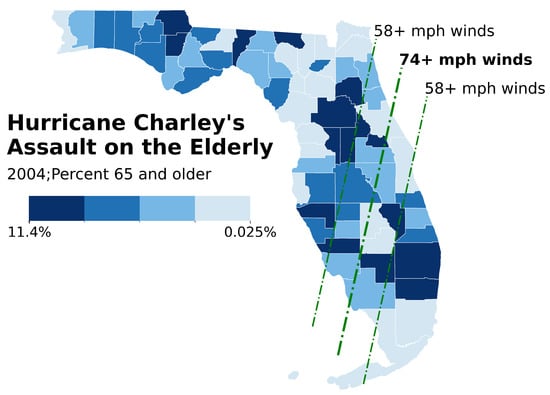 In Figure 8, the model was evaluated for its ability to interpret and critique visual cartographic elements of a map illustrating the percentage of the population aged 65 and older in Florida counties during Hurricane Charley in 2004, overlaid with the storm’s wind path. This map, reproduced from Krygier and Wood [], intentionally designed with flaws to test the model’s critique capabilities. The model successfully identified issues such as poor color gradient choice and ineffective visual hierarchy—problems particularly relevant for older viewers who may experience reduced color perception or color vision deficiencies. However, while the model provided actionable suggestions to address these issues, it disproportionately relied on adjustments to color properties, despite the original source of the map (Krygier and Wood []) emphasizing the importance of incorporating a variety of visual variables, such as appropriately sized proportional symbols, to enhance map readability and accessibility.