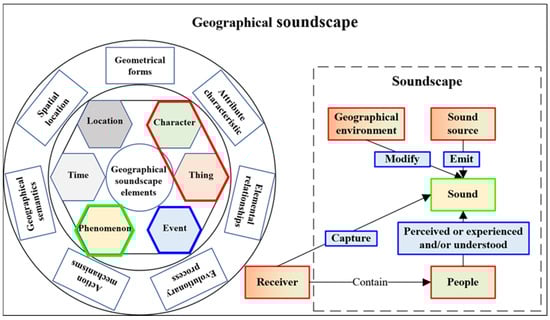The geo-soundscape cannot be separated from the comprehensive effect of three aspects: the sound source, geographical environment during the propagation process, and receiver that receives the sound signal. In response to the current situation, in which only the extraction and calculation of the acquired acoustic signals are considered, this study expands multiple elements, such as the geographical environment and interaction relationship between them, to construct the conceptual framework of the geo-soundscape. The differences and similarities between a traditional soundscape and a geo-soundscape are shown in Figure 2. A traditional soundscape pays more attention to the perception and reaction of the subjective receiver (human) to the sound, while the geo-soundscape places more emphasis on the geographical environment and the relationship and action mechanism between the sound elements and the geographical environment elements in the soundscape. The receiver should not be limited only to humans, who are only a special case of the receiver, but should also consider the soundscape data acquisition and expression of the objective receiver. In the geo-soundscape, the sound source, receiver, and geographical environment are abstracted into six elements, such as people and time, and described by seven dimensions, such as elemental relationship and attribute characteristics, to form a complete geo-soundscape expression and description.