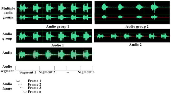 Structural layering is categorized, according to the audio structure, into audio frames, audio segments, audio, audio groups, and multiple audio groups. In this study, audio frame features were used for short-term audio processing. The audio segment features were statistically calculated based on the audio frame. Audio has a temporal structure and semantic content and can contain one category of consecutive sounds or multiple categories of sounds; therefore, the audio can be separated and segmented to detect the jump points of acoustic features and segment the audio units of a certain duration. An audio group is a combination of audio recordings from multiple locations within a certain scene range which can be used to calculate the spatial location of the sound source. Multiple audio groups are combinations of audio groups that expand the scene range. The audio data structure is shown in Figure 3.