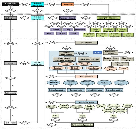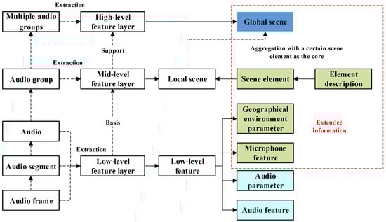 In this study, the geo-soundscape was classified according to its content-abstraction level and the degree of generalization of the content-expression concepts: low-, mid-, and high-level feature layers. The existing soundscape conceptual framework includes audio parameters, audio features, geographical environmental information, and external microphone parameters. On this basis, this study further expands and adds geographical environment information, microphone features, and comprehensively acquired geographical scene elements and their description dimension information to construct a soundscape in a real geographical environment. Figure 4 shows that content layering is correlated with structural layering, where some of the low-level features and parameter information are obtained based on on-site recordings, such as geographical environmental parameters, some of which need to be extracted based on audio frames/segments, such as audio features, and some of which need to be obtained based on multiple audio groups, such as the global scene for high-level features.