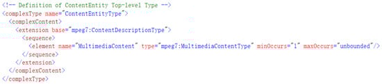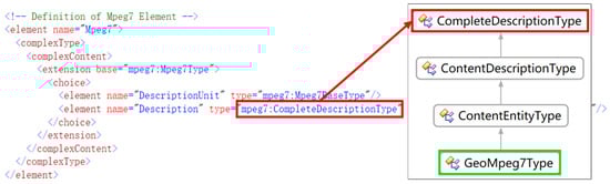 As “MultimediaContent” is an element node that describes the information related to multimedia content, “ContentEntityType” (the parent class of “MultimediaContentType”) is selected to expand the description information of non-multimedia content (e.g., microphone features, environmental parameters characteristics) and extend the type inheritance, as Figure 9 shows. This implies that when the Geo-MPEG-7 class was instantiated, the MPEG-7 content was completely included in the Geo-MPEG-7 framework.