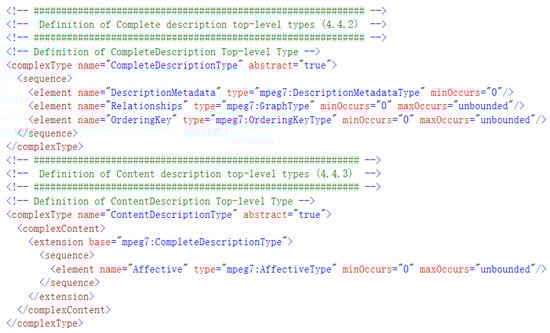 To facilitate expansion, MPEG-7 defines only a root element, named MPEG7, an optional top-level sub-element (DescriptionUnit or Description), and an abstract top-level sub-element category. Therefore, users can extend and modify the top-level sub-elements by inheriting and implementing the top-level sub-element category. The DescriptionUnit can represent part of the multimedia content information using any type defined in the MPEG-7 framework, while the Description is a complete description of the multimedia content using the abstract type “CompleteDescriptionType”. As Figure 6 shows, this study selects the descendant types of the abstract type “CompleteDescriptionType” of the “Description” node for inheritance and expansion.