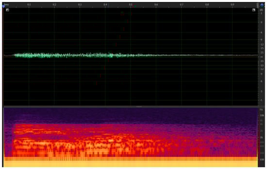 A human voice recorded for 1 s is used as the sound source (see Figure 11 for the spectogram), and audio features are extracted based on the MPEG-7 audio standard; that is, the MPEG-7 audio encoder (see “https://mpeg7audioenc.sourceforge.net (accessed on 15 January 2025)”) is used for calculation. The results are output to the Geo-MPEG-7 XML file; Figure 12 shows some of the stored results.