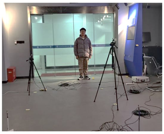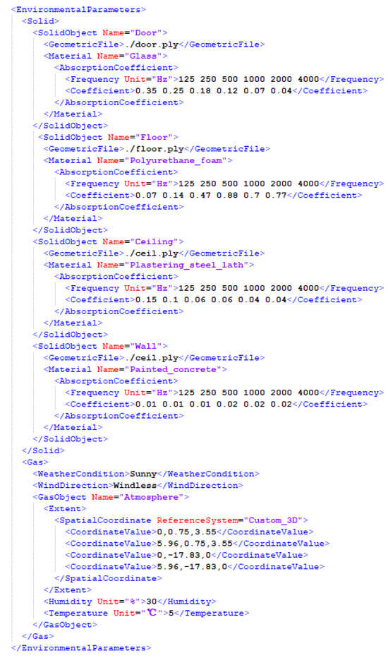 Figure 13 shows a field diagram for an example geographical environment parameter information for recording this 1 s human voice. After the sound source is emitted, the propagation medium to be passed through mainly includes solids, such as doors, floors, ceilings, walls, and air. Atmospheric parameters can be obtained through on-site measurements; temperature and humidity are 5 °C and 30%, respectively. The spatial location of the atmosphere can then be represented by the 3D spatial range as all locations within the indoor scene range. Solids, such as doors, floors, ceilings, and walls, can be used as additional auxiliary information by means of corresponding polygonal geometric model files. As Figure 14 illustrates, all geographical environmental information that needs to be recorded can be stored at the corresponding nodes of Geo-MPEG-7 to describe and express the soundscape at that time as completely as possible.