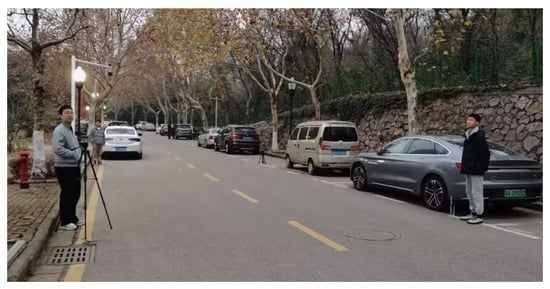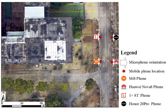 As Figure 15 and Figure 16 show, a section of the main road of a university campus in Nanjing is selected as the experimental area in this study. The experimental area is covered with vegetation and buildings; pedestrians, bicycles, and motor vehicles pass through the section, which contains various features and environments, making it an ideal geo-soundscape scene for an experimental area. The collection points are arranged on both sides of the road, and the cellphone device, which is cheap and easy to carry, is used as the collection device of geo-soundscape information in this experiment. During the experiment, four tripods were used to fix four cellphones, respectively, and all four cellphones were run on Android systems. The sound data acquisition is being carried out in the experimental area, and each cellphone uses the self-developed sound data acquisition app for unified acquisition to ensure that the sampling rate, number of channels, bit depth, and format of the collected audio data are consistent. The sustained bicycle ringing when passing through the roadway is taken as the main collection object, and its low-, mid-, and high-level features are described and expressed in a standardized manner based on the Geo-MPEG-7 framework.