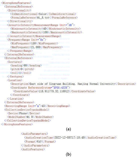 In order to facilitate the demonstration, the audio file captured from one of the cellphones (MI 8) is selected as a Geo-MPEG-7 case study. As Figure 17a shows, the microphone internal reference records that the directivity of the microphone for recording audio is non-omnidirectional and gives a mathematical model of the directivity based on the external link; the effective received sound intensity of the cellphone’s microphone is 40~100 dB, and the received frequency is 150~21,000 Hz. These microphone parameters were obtained based on preset experiments and multiple field measurements in an anechoic chamber. Because of space limitations, only the results are described here (the same applies below). The microphone external reference records that the microphone is placed at the east side of the Xingyuan Building of Nanjing Normal University in Nanjing, Jiangsu Province of China in the east direction (longitude: 118.911779, latitude: 32.116912, WGS84 coordinate system), and the received range is 0~45 m (this parameter is obtained through the GPS built into the mobile phone). As Figure 17b shows, the audio is recorded starting at 17:18:48 on 8 December 2022 and stored in the wav format. As Figure 17c shows, the time-domain features, such as the Zero Crossing Rate and Energy, and the frequency-domain features, such as the Spectral Centroid Coefficient and Mel-Frequency Cepstral Coefficients, of this audio are extracted and recorded in the format defined by MPEG-7 (obtained by audio feature extraction algorithms).