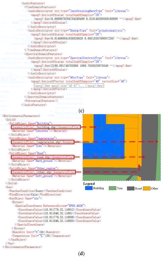 In addition, Geo-MPEG-7 most importantly expands the environment description information, as Figure 17d shows. The case uses a shapefile to record the 2D geometry of the geographical environment, including buildings, vegetation, and roads, and indicates the corresponding materials, which are used to determine the role they play in the sound propagation process. The day of the experiment was sunny with no wind, the outdoor humidity in the area was 50%, and the temperature was 2 °C (measured with a thermometer).
