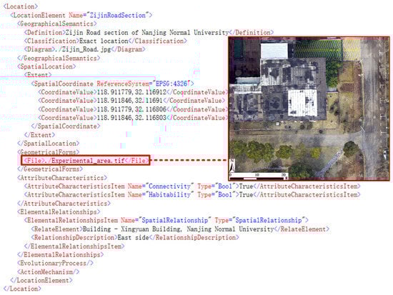 As Figure 18 shows, the location element in the mid-level feature of Geo-MPEG-7 describes the area to the east of the Xingyuan Building of Nanjing Normal University. The area is labeled “Zijin Road Section”, which is semantically described by the road name, the location of the area in the geospatial space is described by the area enclosed by coordinates, and the detailed geometry is expressed by the associated shapefile (unmanned aerial vehicle orthophotos). Pedestrians and vehicles in the experiment can pass freely on the road. Livability indicates that the area is a living area with strict limits on surrounding noise. The area is located in the east side of the Xingyuan Building, Nanjing Normal University.