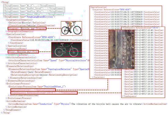 As Figure 19 shows, the thing elements of the Geo-MPEG-7 mid-level features describe the acquisition equipment and carriers in the experiment. Here, the focus is on the carrier element labeled as “Fenghuang Brand Bicycle”. The initial location of the element at the beginning of the experiment is recorded by coordinates, and a 3D geometry file is used to describe the geometry of the element. The “Fenghuang Brand Bicycle” has a limited driving speed and is always topologically adjacent to the character element “Jack”. Furthermore, the “Fenghuang Brand Bicycle” and “Jack” are always adjacent to each other in the movement process. During the movement, the trajectory of the “Fenghuang Brand Bicycle” and “Jack” is consistent. The vibration of the bicycle bell will be further transmitted to trigger the vibration of the air.