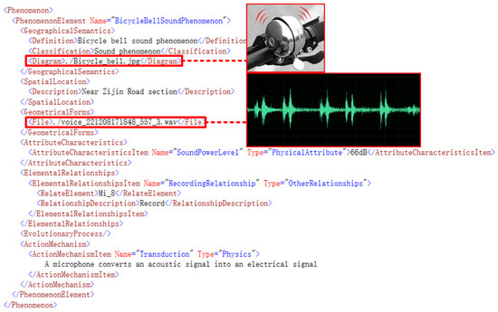 As Figure 20 shows, the phenomenon element of the mid-level feature of Geo-MPEG-7 is a description of the physical acoustic phenomenon element of the “bell sound”. The location of the element is roughly described in text form. The geometry of the element is described in the form of a wave spectrum by means of an external audio file. As an acoustic phenomenon, the “bell sound” has a certain sound power level. The acoustic phenomenon is eventually captured and recorded by the microphone of the cellphones and converted from a sound signal into an electrical signal.