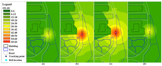 Soundscape distribution results at four time points: (a) 2022-12-08T17:18:49; (b) 2022-12-08T17:18:56; (c) 2022-12-08T17:19:07; (d) 2022-12-08T17:19:11.