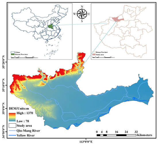 The Qin-Mang River Basin, located in the northwest of Henan Province, refers to the combined basin of the Qin River and its tributary, the Mang River, with a total area of approximately 306,240 hectares. This basin is a key energy and chemical industry base within the Yellow River Basin and is designated as the core area for the Ecological Protection and Restoration Project for the Mountains, Rivers, Forests, Farmlands, Lakes, Grasslands, and Deserts in the South Taihang region of Henan Province, playing a significant role as an ecological barrier. Geographically, the basin spans from 112°20′ to 113°39′ east longitude and from 34°49′ to 35°21′ north latitude. It connects the North China Plain with the Loess Plateau and is located between the second and third geomorphic steps (Figure 1). The climate in the region is classified as a warm, temperate semi-humid climate, with an average annual temperature of approximately 14.6 °C and an annual precipitation of about 641.7 mm, concentrated primarily in the summer months. The basin is rich in vegetation resources, home to 1609 species of higher plants, and supports several nationally protected species. According to the “Ecological Protection and Restoration Plan for Mountains, Rivers, Forests, Farmlands, Lakes, Grasslands, and Deserts in Henan Province”, the Qin-Mang River Basin has been identified as a key area for ecological restoration, involving measures such as forest management, soil and water conservation, and wetland protection. The biodiversity and ESs in this region play a crucial role in ensuring regional ecological security.