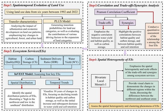 This study established a comprehensive analysis framework to systematically assess the impact of LUCCs on ESs in the Qin-Mang River Basin from 1992 to 2022, with a focus on revealing the TOSs between ESs and their spatial characteristics. Through the land use transfer matrix, this study quantified LUT transformation characteristics and rates at different time periods, analyzing the driving forces of urbanization and economic development on natural land. Coupled with the InVEST model, this study quantified the spatiotemporal dynamics of key ESs such as HQ, CS, SDR, and WY, providing data support for understanding the impact of LUCCs on ESs. Correlation analysis was used to reveal the TOSs between ESs, and bivariate local Moran’s I (BLI) was employed to analyze their spatial clustering and dispersion, identifying key hotspot and coldspot areas. The research framework is shown in Figure 2.