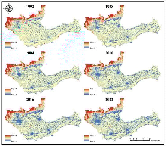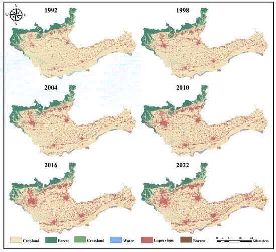 Distribution map of LUTs in the study area from 1992 to 2022.