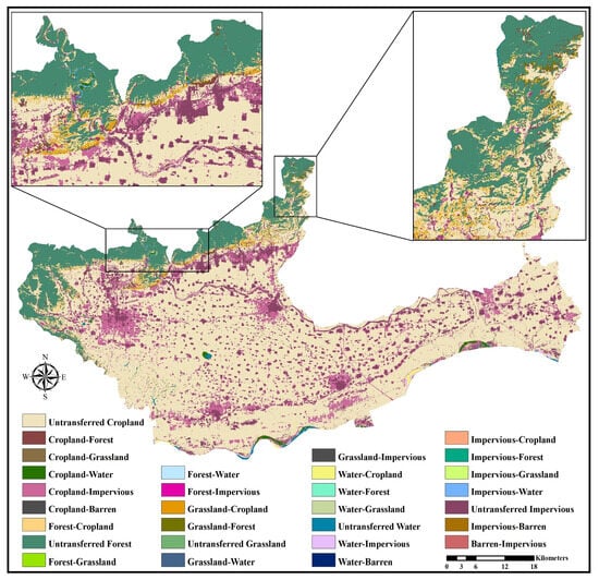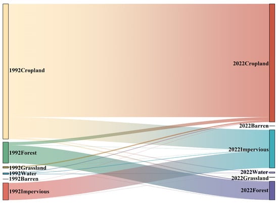 Further analysis of the land use transfer matrix (Table 7) and Figure 4 reveal the processes of LUT transitions between 1992 and 2022. Specifically, cropland decreased by 35,000 ha, mainly being converted into built-up land, reflecting the dominant role of economic development as a driving force behind LUCC. The loss of cropland resources poses a potential threat to food security and reduces its function as a carbon sink. Forestland area decreased by approximately 244.62 ha, particularly in the central and western regions, leading to a significant decline in biodiversity and ecological functions, especially in terms of forest ESs and species habitats. The Sankey diagram (Figure 5) clearly illustrates the conversion trends of different LUTs through the width and direction of the flow, providing a visual representation of the macro dynamics of LUCC.