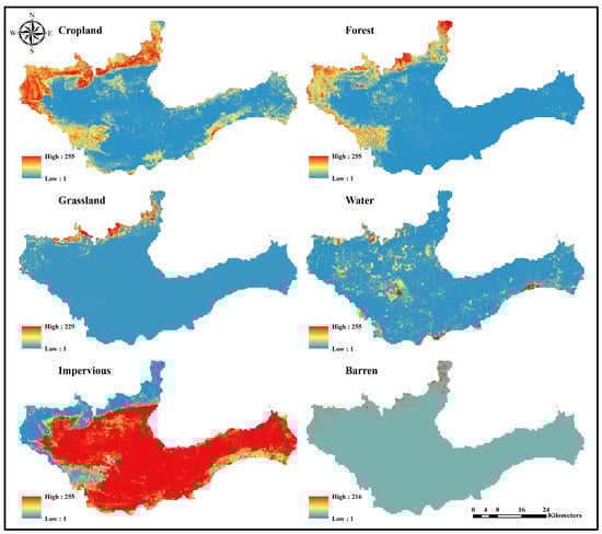 Figure 6 displays the probability of future development for different land types, based on predictions generated by the PLUS model and spatial analysis with ArcGIS, revealing the trends in the expansion of different LUTs. The results show that, in the context of rapid urbanization and economic growth, the probability of expansion of built-up land is high, demonstrating the strong influence of the urbanization process on land use patterns. In contrast, the probability of expansion of cropland and forestland is declining, indicating that these natural land types will continue to face pressure from urbanization. Particularly in areas of rapid economic development, the compression of cropland and forestland will further intensify the impact on ecosystem service functions.