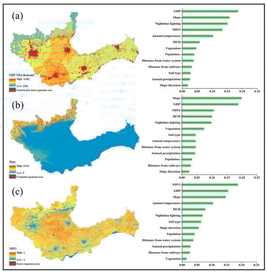 (a) Relationship between newly added built-up land and GDP level, along with the contribution of expansion driving factors; (b) relationship between newly added arable land and slope, along with the contribution of expansion driving factors; (c) relationship between newly added forest land and NDVI values, along with the contribution of expansion-driving factors.