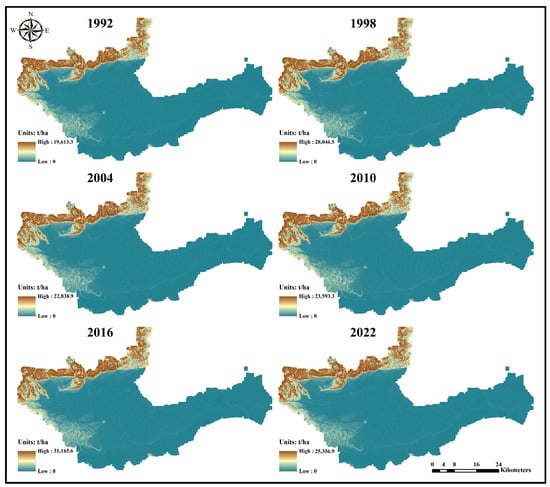 Time-series analysis shows that the volume of SDR initially increased and then decreased. From 1992 to 2016, the volume of SDR increased from 19,613.3 t/ha to 31,165.6 t/ha, but by 2022, it had declined to 25,356.9 t/ha. This change is closely related to LUCCs, topographical features, and vegetation cover. Particularly in the southeastern region, rapid urbanization, the reduction in agricultural land, and the expansion of built-up land severely impacted SDR. In contrast, the northwest region, with better vegetation protection, maintained a relatively stable level of SDR.