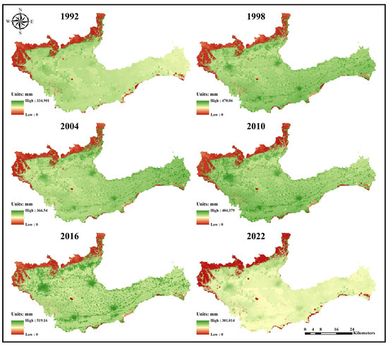 The WY from 1992 to 2022 in the Qin-Mang River Basin, calculated using the InVEST model based on average annual precipitation, evapotranspiration, and root limiting layer depth data, shows a “high in the southeast, low in the northwest” distribution pattern (Figure 11). The southeastern region, with abundant precipitation and lower elevation, has a higher WY capacity, while the northwestern mountainous areas, with high evapotranspiration and low precipitation, have a lower WY capacity. Although the overall spatial distribution of WY did not change significantly, the rapid urbanization process, particularly in the central region, has negatively impacted WY services.