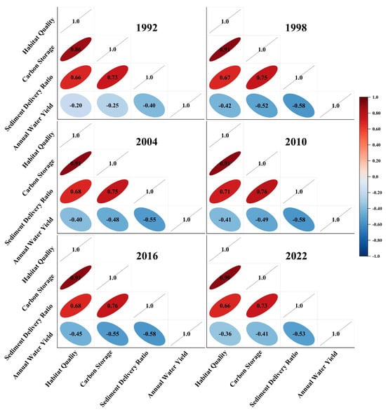 Pearson correlation is a widely used statistical method for quantitatively assessing the linear relationship between two variables. The correlation coefficient ranges from −1 to 1, with a value of 1 indicating a perfect positive correlation, −1 indicating a perfect negative correlation, and 0 indicating no correlation. Specifically, a larger positive correlation value suggests the potential for a synergy effect between ESs, while a negative value indicates the possibility of a trade-off effect. All correlation analyses were conducted using Origin software, with the formula as follows [31].