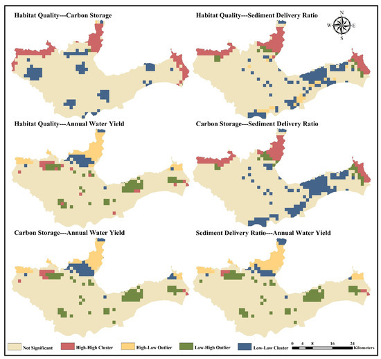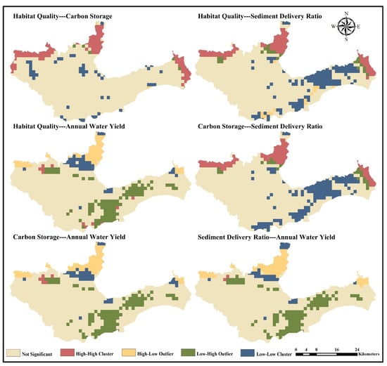 To further investigate the spatial distribution and interactions of ESs, this study employed BLI to explore spatial autocorrelation and clustering effects. Positive values in the Moran scatter plot indicate the presence of synergy effects between services, suggesting that they tend to increase or decrease together. Negative values, on the other hand, indicate trade-off effects, where the enhancement of one service is associated with the decline of another. The clustering map further reveals spatial aggregation effects and heterogeneity patterns. All calculations were performed using GeoDa software, with the formula as follows [32].