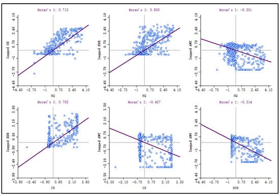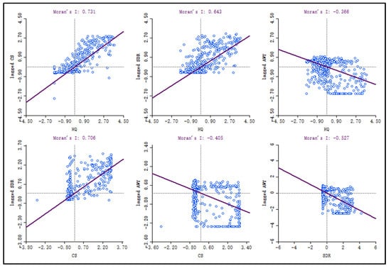 By 2022, the spatial distribution of ESs in the Qin-Mang River Basin had undergone significant changes (Figure 15). Particularly in the southern and eastern regions, the trade-off phenomena between ESs became more pronounced, with the negative correlations between HQ and WY and between SDR and WY strengthening in these areas. The spatial autocorrelation analysis in 2022 revealed an increase in the number of low-value regions, where ESs experienced severe degradation, the synergies between services were significantly weakened, and trade-off phenomena were significantly exacerbated. The BLI scatter plot showed (Figure 16) that there was a significant positive spatial autocorrelation between HQ and CS (Moran’s I = 0.731), HQ and SDR (Moran’s I = 0.643), and CS and SDR (Moran’s I = 0.706), while significant negative spatial autocorrelation was found between HQ and WY (Moran’s I = −0.366), CS and WY (Moran’s I = −0.405), and SDR and WY (Moran’s I = −0.527). All results had P values less than 0.05, and, through randomization tests, the probability of these clustering patterns being generated was less than 1%, confirming the statistical significance of these spatial autocorrelation relationships.